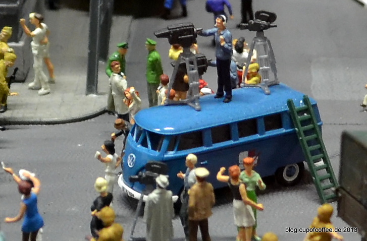 Die betagten beiden Fernsehkameras (auf dem VW-Bus vorne sowie direkt dahinter etwas verdeckt) sind zweifelsfrei auf die Kameramänner (also nach rechts!) gerichtet, denn die Sucher sind jeweils links und die Wechselobjektive (Objektivrevolver) sind bei beiden rechts.