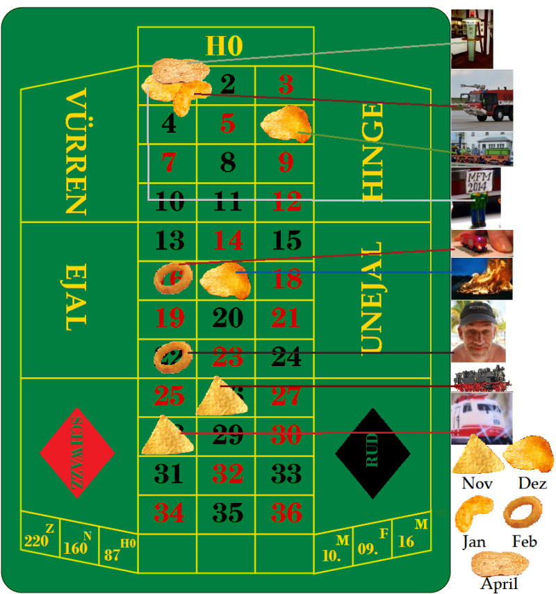 Und hier kommt auch das Tableau ins Bild. Da wir die Spielchips nicht wiederfinden konnten, müssen wir uns diesmal mit Kartoffelchips begnügen. Dieselben stehen für den Dezember. Die November-Setzer bekommen Nachos, Januar werden Flips ausgegeben, im Februar die Zwiebli-Ringe und für April haben wir da noch eine ungeschälte Erdnuß. Auf Feld 1 kommt es zu einer bunten Nascherei, weil gleich drei unserer Zocker sich dieses Datum ausgesucht haben. Und nun: