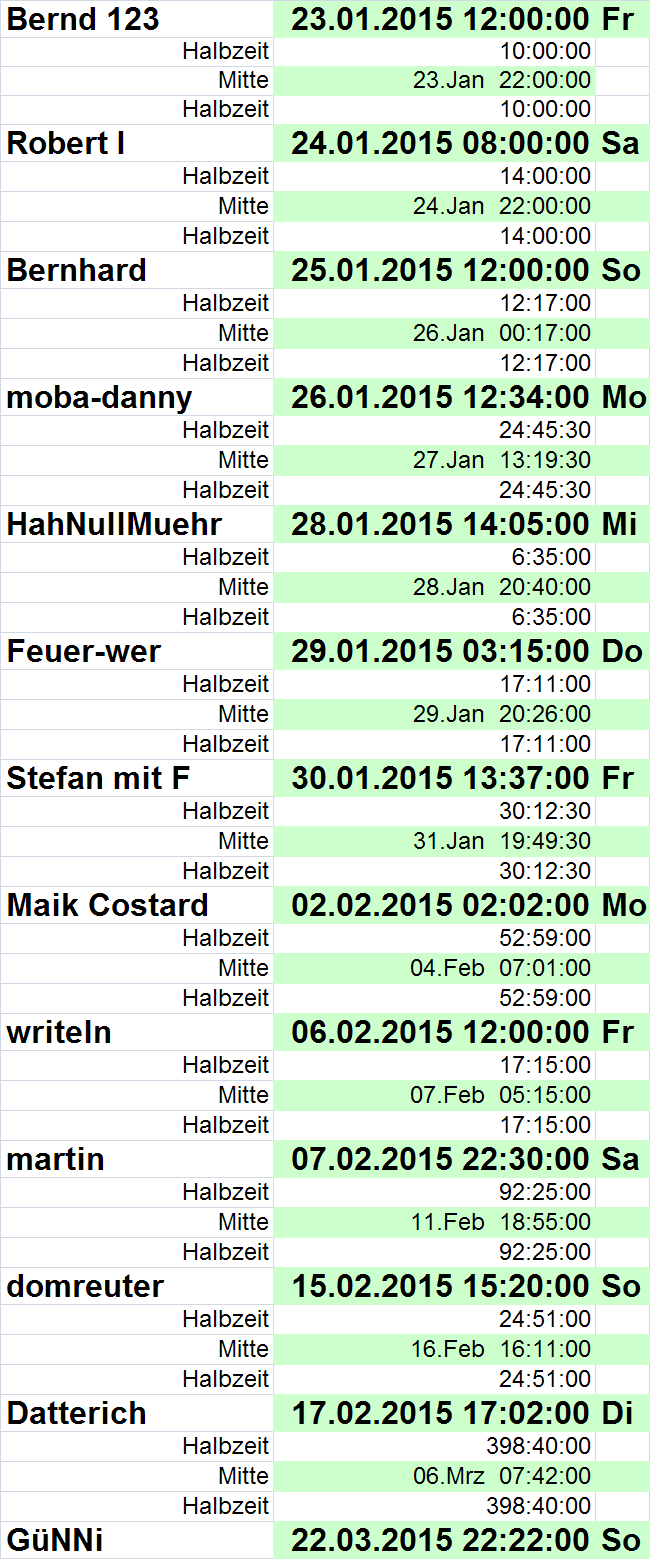 Genau in der Mitte, am 24.01. um 22:00 Uhr geht verlierst Du die Chance auf den ersten Platz und Bernhard übernimmt. Zwischen dem 24.01. um 08:00 Uhr und dem 24.01. um 22:00 Uhr vergehen 14 Stunden, daher ist dies die "Halbzeit".