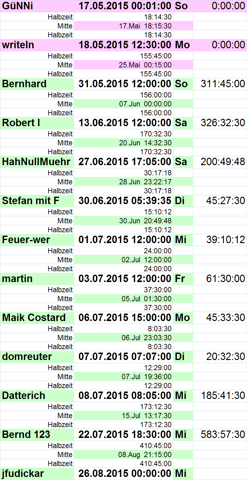 Damit ist Bernhard raus (schon länger) und Roberts Uhr tickt. Und das tut sie noch bis zum 20.06., 14:32:30h, also fast eine Woche. Das wird langsam eng für alle weiteren Mitspieler.