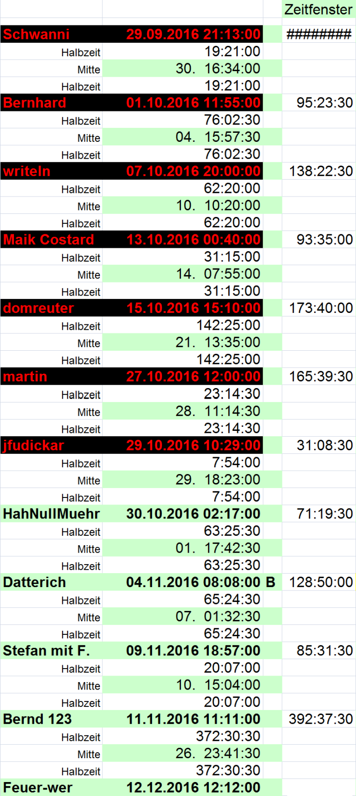 Wenn Du also auf 10.10 10:10 bestanden hättest, hättest Du Dich in ein recht enges Zeitfenster gesetzt (31 Stunden). So stehst Du etwas besser (204 Stunden), zum Leidwesen von Feuer-Wer, dem noch 93 Stunden bleiben. Gruß