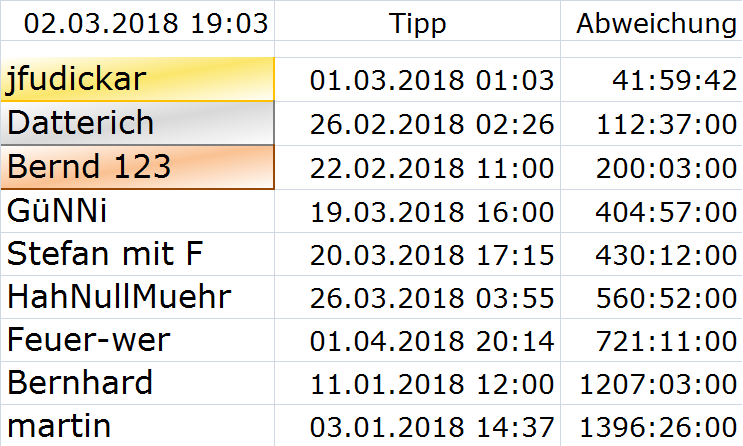Datterich, der mit seiner Voraussage nur 112 Stunden und 37 Minutebn daneben lag trägt das virtuelle Silberbleh nach Hause. Doch beide können nicht das Wasser reichen