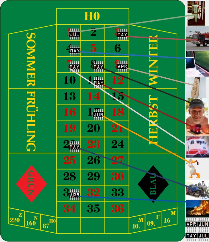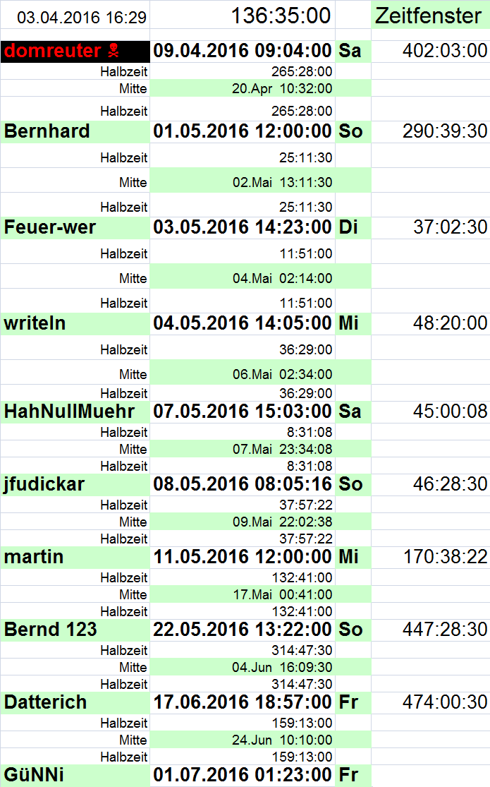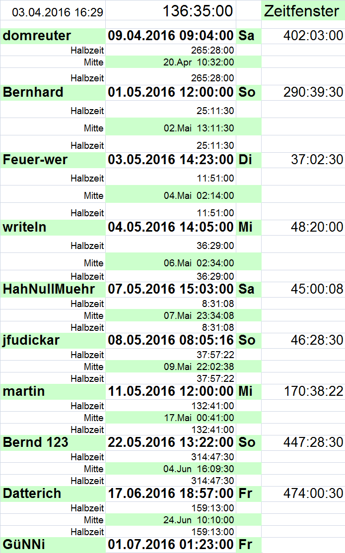 Hier ist das offizielle Plateau (eine Mischung aus Platine und Tableau), komplett mit den Chips bestückt:Und hier, wie üblich, die Tabelle mit den exakten Zeiten, die teilqweise sogar sekundengenau eingereicht wurden: Wir sehen eine Häufung der Tipps in der ersten Dekade Mai 2016.