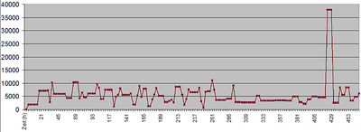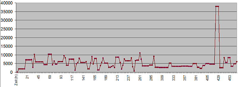 Ausgehend vom 14.01. (3,5-MC-Marke) bis heute sind also etwa 480 Stunden vergangen. Aufgedröselt in 3-h-Intervalle ergibt sich das unten stehende Bild. Die Click-Zahlen für je drei Stunden dümpeln um die Marke 5.000 herum. Die 110kC, die Bernd errechnete sind also ein (völlig unvorhersehbarer) Ausreißer. Sämtliche Clicks seit 3,5MC bis jetzt verteilt auf alle verfügbaren Minuten entspricht einer Rate von 30,8 Clicks/Minute. Zum Vergleich: In der ersten Woche nach Release hatten wir eine Rate von 94/Minute! Etwas abgeschwächt hat es sich also schon. Insgesamt scheint die Zuwachsrate leicht unter die Marke von 5.000/3h zu wandern.