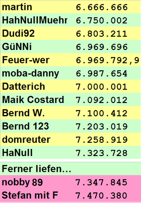 Soviel zur Theorie. Hier noch das vervollständigte Tableau, mit den Teilnehmern, die "außer Konkurrenz" starten:Im Eröffnungspost, 15.03.2012 02:00, HahNullMuehr hat geschrieben:[...] Sollte der unwahrscheinliche Fall eintreten, das zwei Vorhersagen exakt gleich weit vom tatsächlichen Ergebnis liegen, so zählt die NIEDRIGERE der beiden Zahlen als Gewinner. [...]