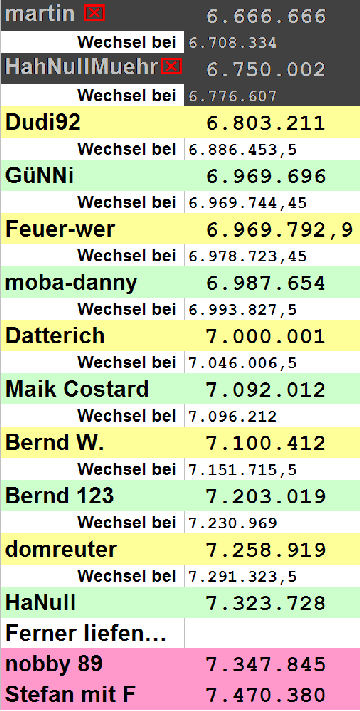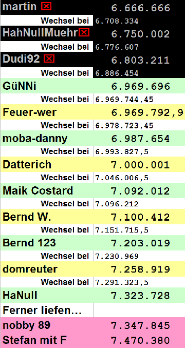 Und damit ist leider, leider, leider, martin aus dem Rennen, der mit seinem 7mal6-Tipp ein wenig zu pessimistisch gelegen hat. (7 x 6 übrigens = 42!)