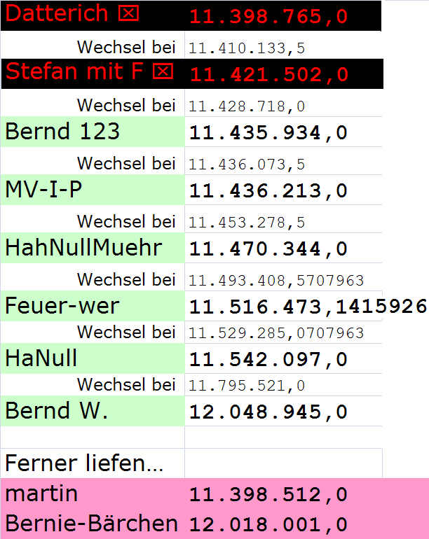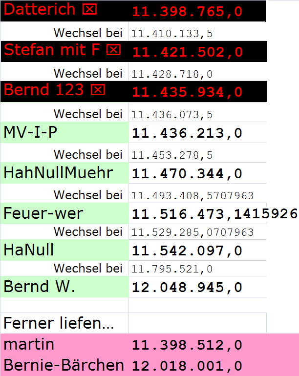 jetzt aber nicht hektisch werden. Bei den gegenwärtigen Clickraten von 3 - 5 kC/d, Tage, haben wir noch 100 - 160 Tage Zeit, bevor der 12. MC gefeiert wird, also auch noch 50 - 80 Tage bis zum rijäng-näwa-plüh.