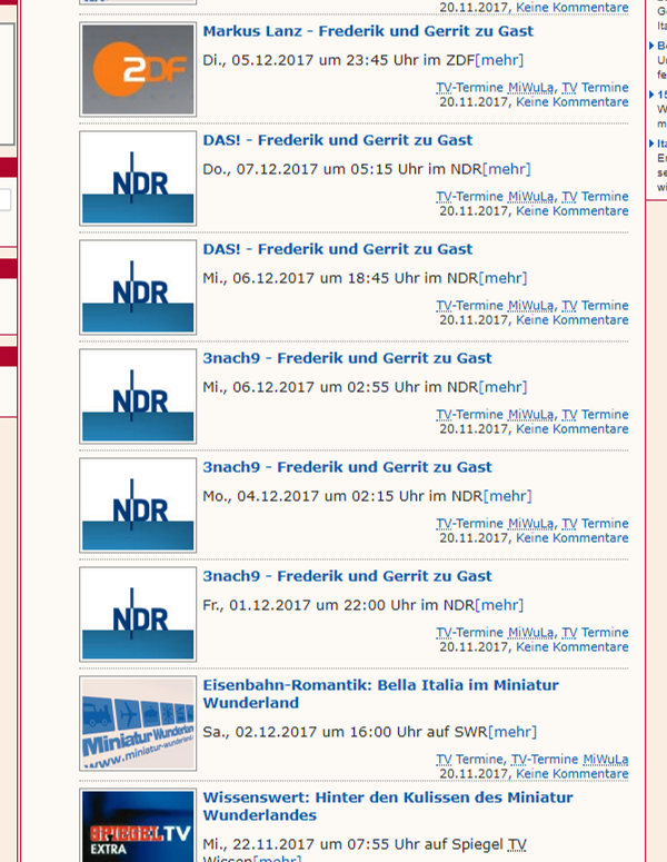Sendetipps und Diskussionen zu TV-Beiträgen rund ums Thema Miniatur Wunderland