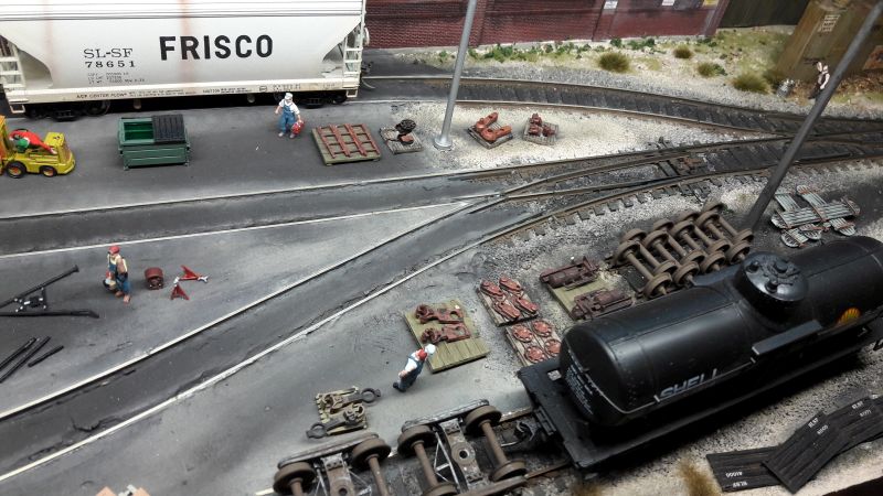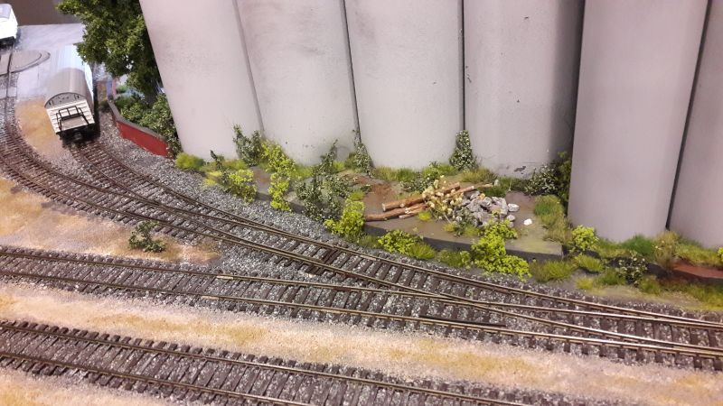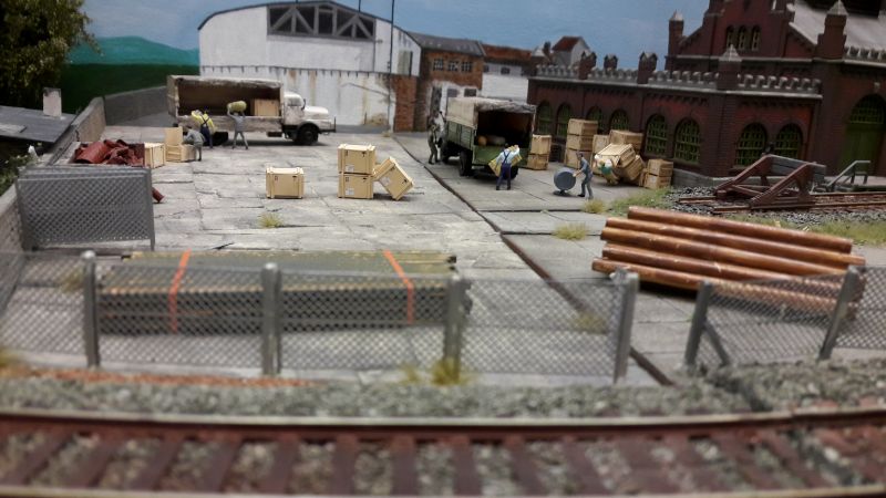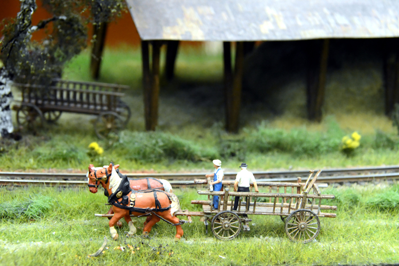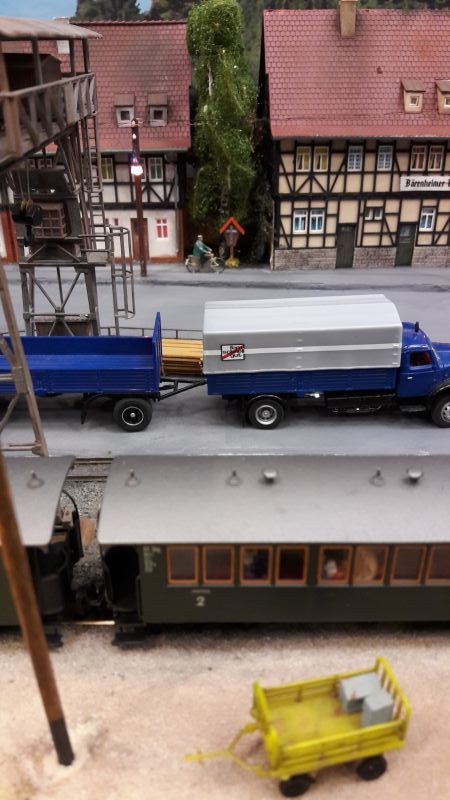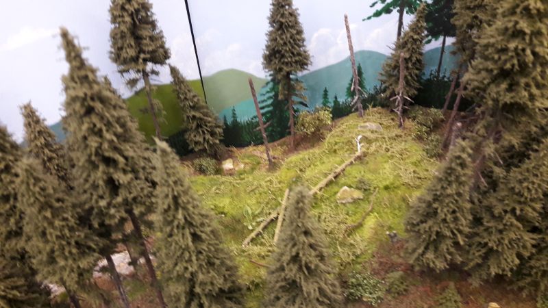 Ein paar Kleinodien hab ich noch. Hier ein detailreich ausgeschmückter Betriebshof, bei dem dazugesagt werden muss, dass das weiße Gebäude im Hintergrund eine sehr gut wirkende Malerei ist. Auch hier ist das Gebäude in der Bildmitte eine perspektivische Malerei (Sorry, Aufnahme etwas unscharf). Allerdings stimmt die Perspektive meist nicht mehr, wenn man einen oder zwei Schritte zur Seite geht. Und zu guter Letzt noch ein Beispiel, wie man langweiligen Wald ein wenig auflockern kann, im Wortsinne! Ein gut gemachter Windbruch liefert auch Vorwand zum Einsatz von Hozfällern, Langholztransportern, Rückepferden etc. Den Holzweg nicht vergessen. So, das wars aus meinem Objektiv. (Handy mit 13 mpx-Kamnera)