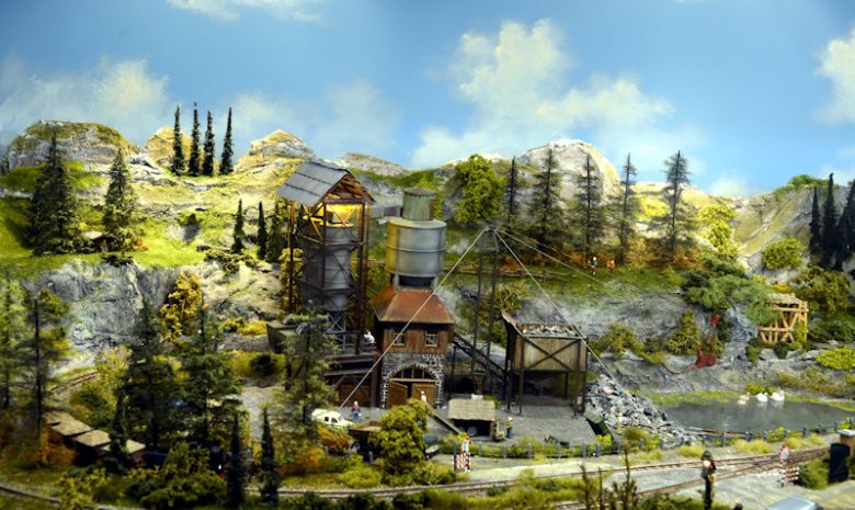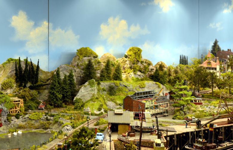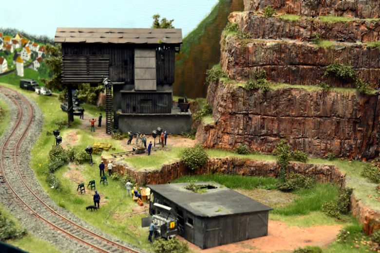 Das Ganze misst geschätzte 120 cm in der Breite, ist in Spur 0e ausgeführt (Maßstab 1:45; das sind zwar 16,5 mm Spurweite, im Vorbild aber nur 750 mm) und JEDES Detail ist aller-liebevollst ausgeführt. Auch der Big Boy wurde bis auf zwei Achsen abgespeckt.(Links im Bild) Der Mann mit der Stange hat wohl gerade das Ruderboot ins Wasser gekrant. +++ wir fortgesetzt +++