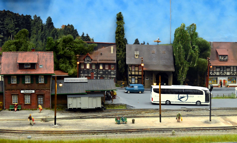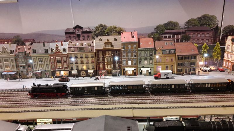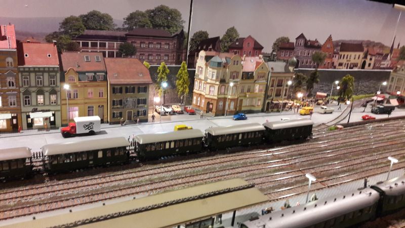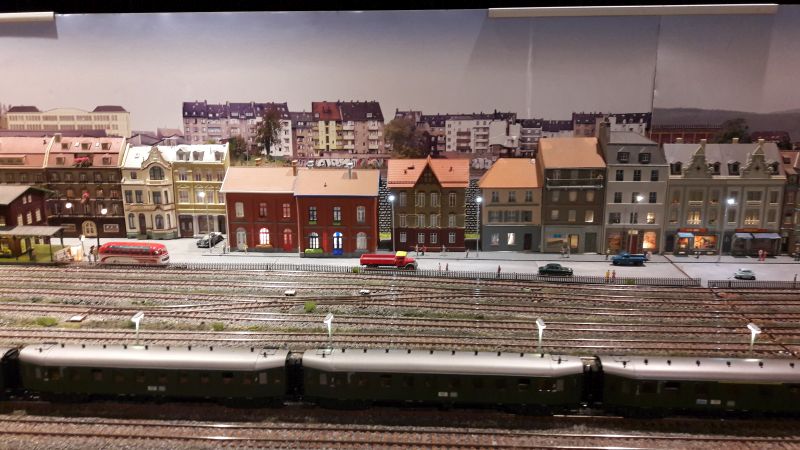 Auf (geschätzt) 6 Meter Länge ist im Wesentlichen ein großer Bahnhof gebaut. Entlang der Straße steht eine einzige Häuserzeile, die Modelle sind zum Teil sogar halbiert, so dass man aus einem Bausatz "zwei" Häuser erhält. Das ganze wiederum garniert mit einem fotografischen Hintergrund, der die Ausdehnung der Stadt schinbar erweitert. Auch stilistisch passen die meisten Häuser recht gut zusammen, nur auf die Stelle unten hätte ich als Erbauer verzichten mögen. Die beiden Ziegelhäuser (links der Mitte) passen vom Stil her nicht in die Stadt-Zeile, zudem scheinen sie im Maßstab irgendwie daneben zu liegen. Beachtet die Geschosshöhen! Um die Größenwirkung nochmals zu steigern war am Ende der Anlage ein Spiegel aufgebaut, so dass die Stadt gleich doppelt so groß wurde. Schade nur, das der Hintergrund stellenweise etwas unsauber gefügt war.