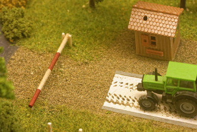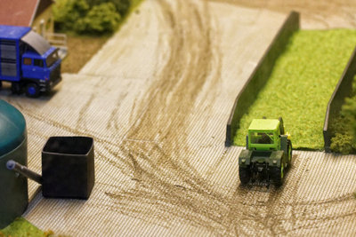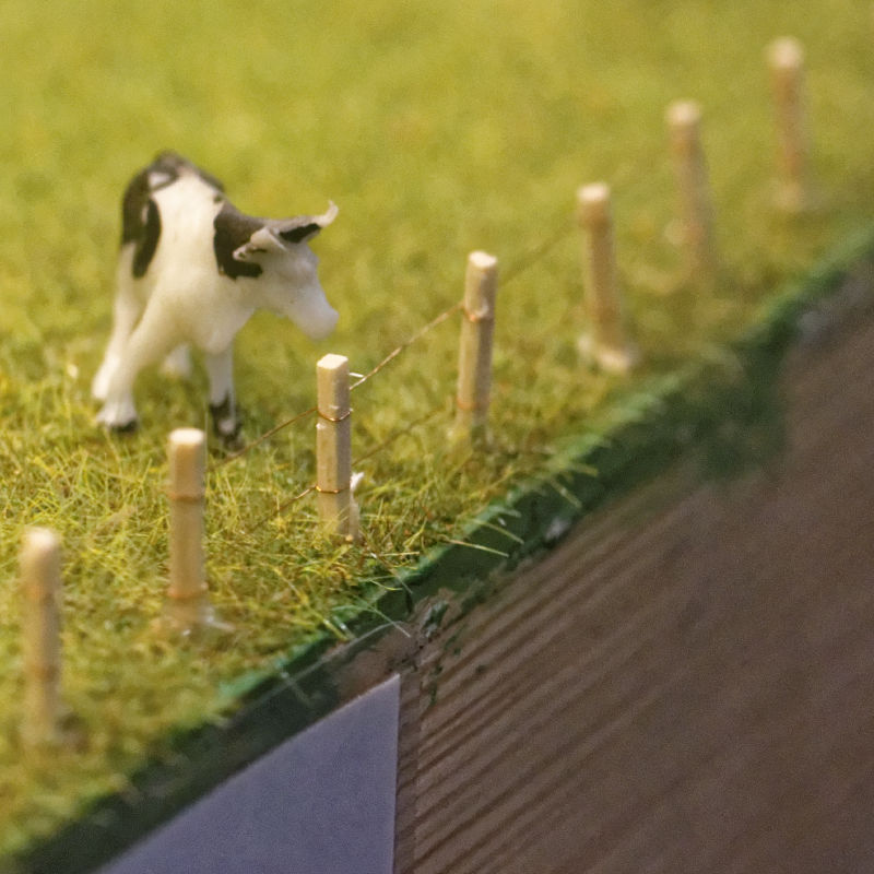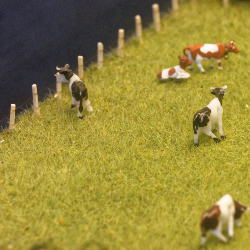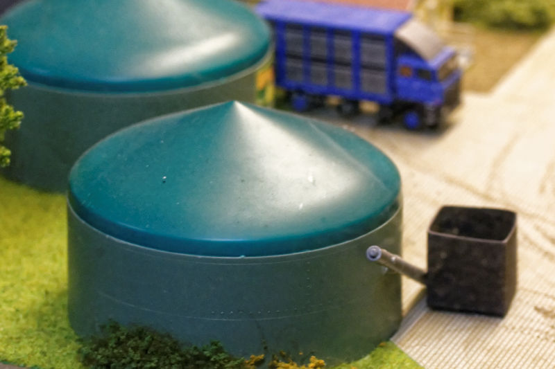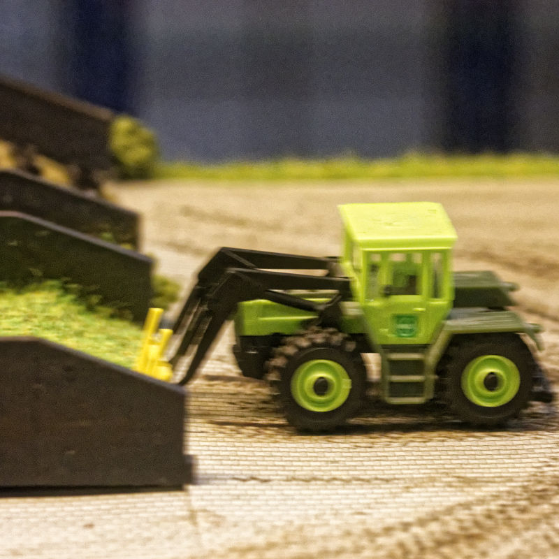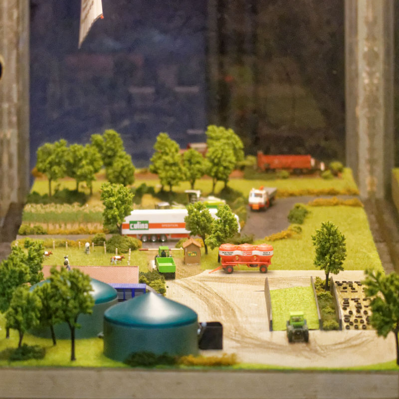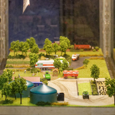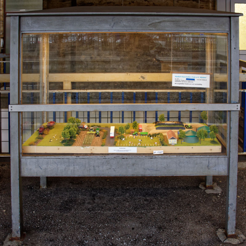 am Montag, den 30.11.015 hatte ich einen halbstündigen Aufenthalt am Mindener Bahnhof. Dort entdeckte ich das folgende Diorama:Es stellt eine Biogasanlage in landwirtschaftlicher Umgebung dar, erstellt durch den Modelleisenbahnclub Minden e. V., mit dessen Vorstand ich vorhin ein nettes Telefongespräch hatte, indem ich die Erlaubnis erfragte, die Bilder hier einzustellen:Den richtigen Schärfepunkt zu finden lerne ich irgendwann auch noch...Natürlich gehören zur Landwirtschaft auch Tiere...Für diese Kuh ist die Welt immer noch eine Scheibe:Schön gelungen finde ich die Spuren auf den Pflastersteinen:Wenn man mit dem Traktor lange genug hin und her fährt, sind die Reifen beinahe blitzblank:Dann darf er vielleicht auch das Gelände verlassen...Die Biogasanlage darf natürlich nicht fehlen:Und noch ein Blick von der schmalen Seite des Schaukastens aus:Schön ist, dass der Kasten von drei Seiten aus begehbar und von innen beleuchtet ist. Dadurch ist auf meinen Fotos trotz fehlendem Stativ und abendlicher Stunde noch etwas zu erkennen.