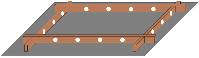 Auf dem Glas und den Scharnieren würde ich dann eine weitere Platte legen, die dann entsprechende Einkerbungen hat und am Ende mit Schraubzwingen festziehen (Für Umzüge etc). Damit die Platten auch einen festen Stand haben, dachte ich an 4 Holzpfeiler,