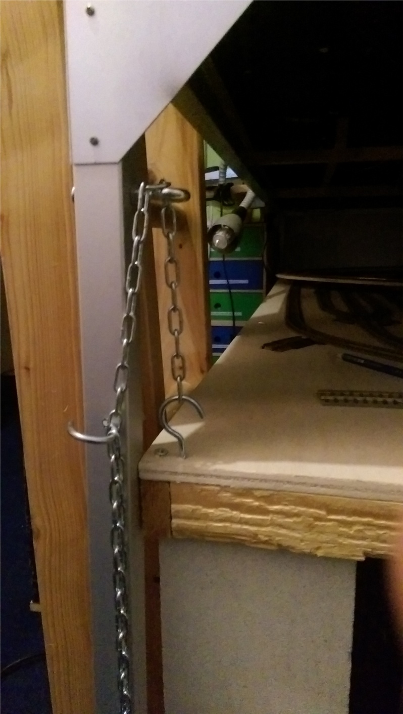 seit langem sind bei uns zu Hause Vater und Sohn mit dem dem lange gehegten Wunsch beschäftigt, die Noch-Fertiganlage "Mühltal", die bei uns unter einem Hochbett platziert ist, mit einer 2. Ebene zu versehen. Es sollen zwei Gleiswendeln dorthin führen. Da wir die 2. Ebene gut ein und ausbauen können wollen, haben wir uns eine Aufhängung für die zweite Ebene ausgedacht, die aus einer Kette und zwei Hakenschrauben an jeder der vier Ecken der 2.Ebenen-Platte bzw. dem Gestell der Fertiganlage bestehen soll (siehe Bild).