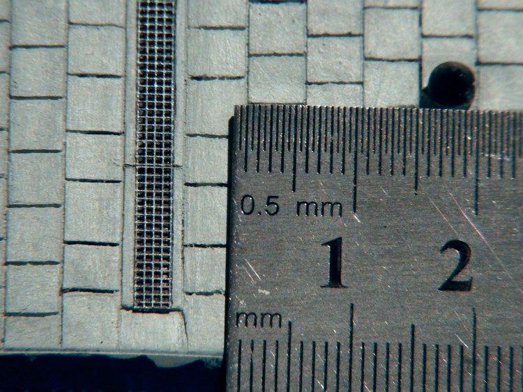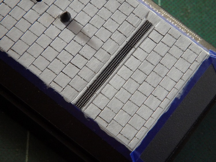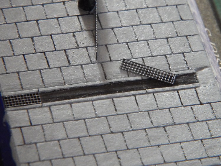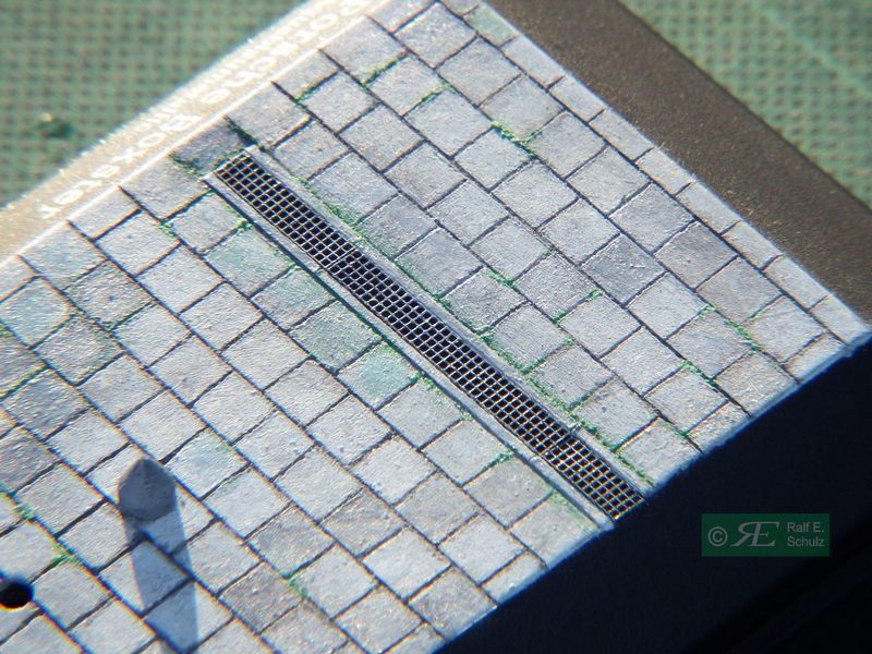 Tja, speziell konstruierte Gitter bzw. eine ganze Abflussrinne hätten mir ja auch gefallen, aber ich hatte nun mal nur ein einfaches Stück Gitterblech zur Verfügung, von dem ich die Streifen abgeschnitten habe. Anfangs hatte ich mir auch überlegt, die kleinen "Streben" (vom Abschnitt) stehen zu lassen und als Standfüße umzubiegen,die ich eventuell mit einem heißen Lötkolben und sanften Druck von oben auf die Gitter ins Plastik drücken könnte. Wurde natürlich umgehend wieder ad acta gelegt, hätte hier gar nicht funktionieren können. ^^