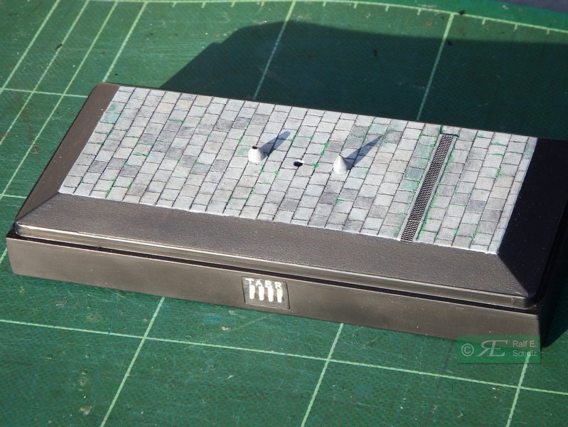 Und für eine Platte unter dem Gitter wäre das Sockelmaterial nicht dick genug gewesen. Hätte ich natürlich trotzdem dann in einen breiteren "Schlitz" einpassen können, aber im Nachhinein wäre das doch zu aufwendig gewesen. Ganz nebenbei wäre das nur eine Verlagerung des Problems, denn ob ich die Gitter auf eine zusätzliche Platte klebe oder direkt hier ins "Bett" macht keinen Unterschied.Was bei Sekundenkleber hier halt stören kann (nebst möglichen Ausdünstungen) ist der Glanz des getrockneten Klebers, macht sich nicht so gut, wenn das Schwarz eigentlich Tiefe suggerieren soll.