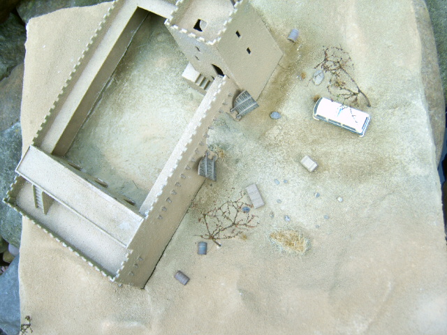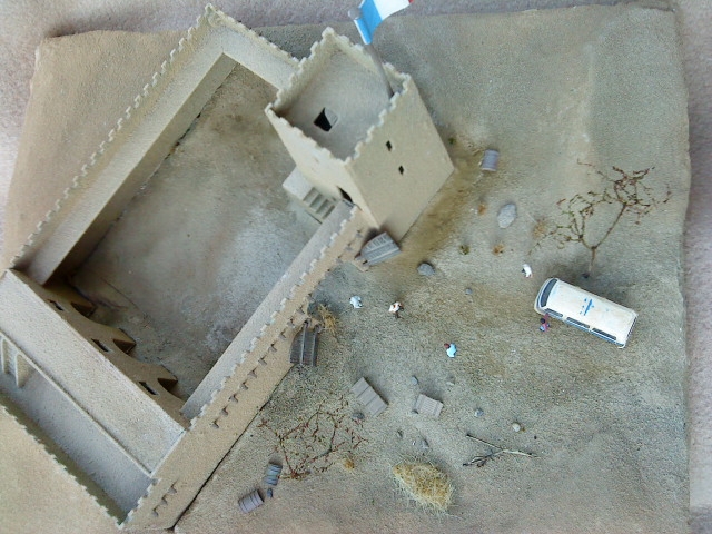 Soll das Gebäude selber vom Dioramaboden abnehmbar sein? Wenn nicht, dann müsstest du noch ein paar Fugen am rechten Teil auffüllen.