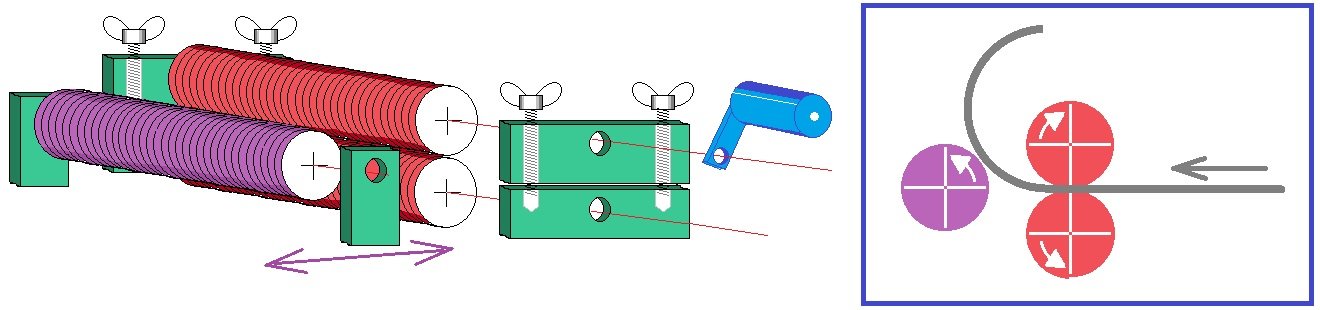 Bei der Skizze habe ich als Walzen Gewindestangen angedeutet, was einem durchgewalzten Blech eine Wellenstruktur gibt. Die Anordnung eignet sich auch für das Biegen von Drähten und Rundprofilen, dazu muss auf den Walzen nur eine Führungskerbe sein, damit das Werkstück nicht seitlich ausweichen kann.