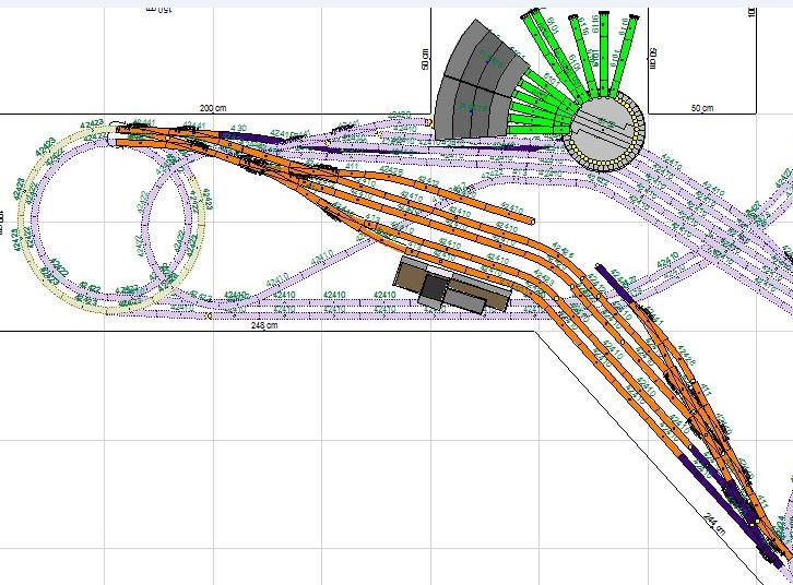 Den einen Reparaturschuppen noch nach Süden verlegen, dann könnte ein Zubringer zum Ersatzteilmagazin noch dazwischen passen (auch als Schad-Fahrzeug-Abstellgleis zu nutzen).