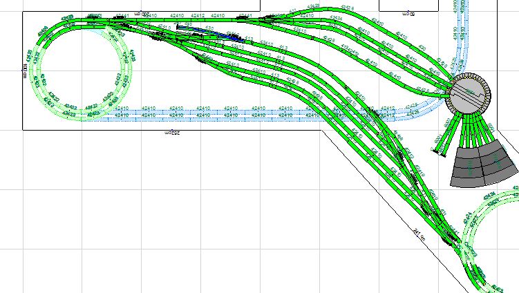 Konstruktiv schlage ich vor: das Bw (oder dessen Überreste) im Südosten der Drehscheibe anzulegen. (Ich kann mir jetzt die Höhen-Lagen nicht genau vorstellen, aber wenn die östliche hellblaue Trasse genügend tief liegt, könnte das Bw-Gelände darüber gebaut sein.