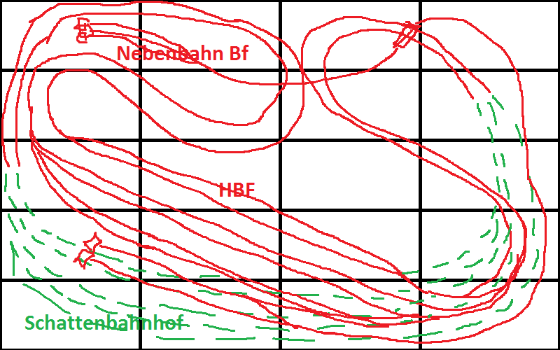Das ist ein großes Projekt. Was erwartest Du? Einen komplett ausgearbeiteten Gleisplan? So?So sieht eine erste Skizze aus, wie man einen Hauptbahnhof an zweigleisiger Strecke mit Nebenbahnanschluss und Schattenbahnhof planen könnte... und genau das auszuarbeiten (Du kannst dafür gerne mein oberes, noch nicht bemaltes Bild nehmen) und z.B. mit Paint skizzieren, wo nach deiner Vorstellung Gleise, Strassen, Berge, Seen, Tunnel und anderes untergebracht sein soll.Steve-18 hat geschrieben:Es soll Oberleitung und Schattenbahnhof verbaut werden.