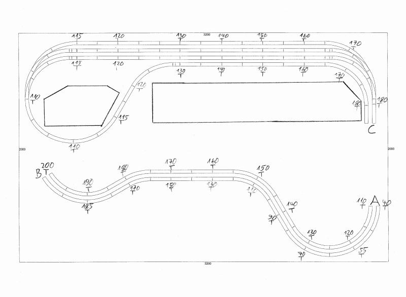 Ich habe dabei mal aus den 12 Gleisen 11 gemacht - ansonsten wäre das Ganze eine Millimeterarbeit geworden, unter der letztlich die Breite der Luke gelitten hätte - denn bedenke, dass Du da auch noch in ein paar Jahren reinpassen musst, und das am besten ohne akrobatische Verrenkungen:Von diesem Schattenbahnhof aus könnte man über Anschluss A auf einer Paradestrecke zu Anschluss B fahren:Im hinteren Bereich habe ich einen zweiten Schattenbahnhof mit nochmal drei Gleisen eingezeichnet, der über Anschluss C mit dem Rest der Anlage verbunden ist:Dieser Rest der Anlage besteht nach aktuellem Stand aus einem 5-gleisigen Durchgangsbahnhof. Ein wenig "Landschaftsgestaltung" habe ich mal exemplarisch angefangen:Die "T"s mit den Zahlen darüber dins übrigens Höhenangaben in Millimeter übder dem tiefsten Punkt der Anlage. Steigungsmäßig habe ich dabei versucht, bei unter 3% Steigung und unter 5% Gefälle zu bleiben... teilweise sind es nur 2% Steigung... so gut es eben geht.