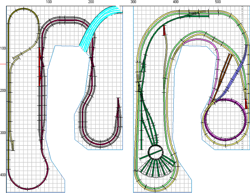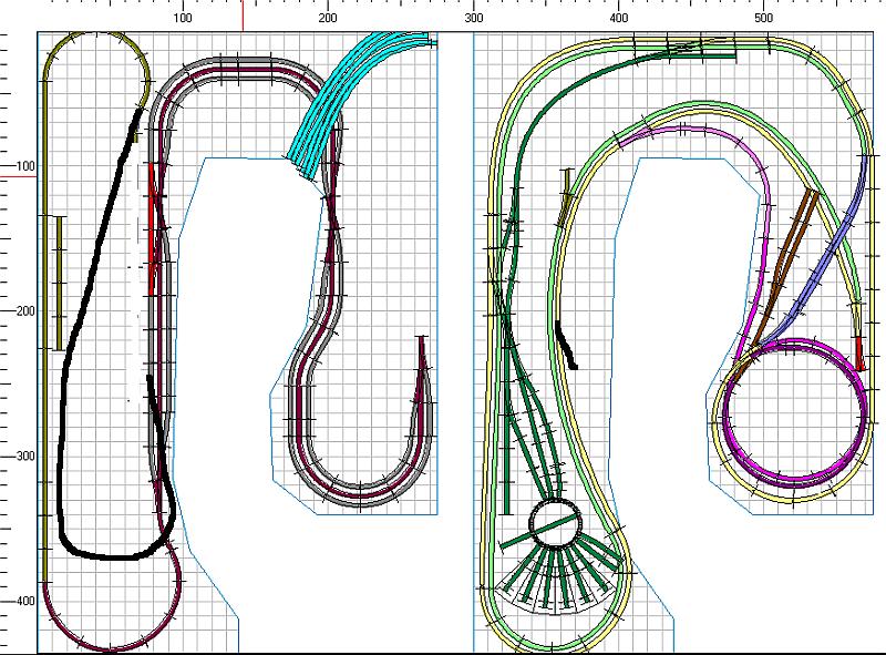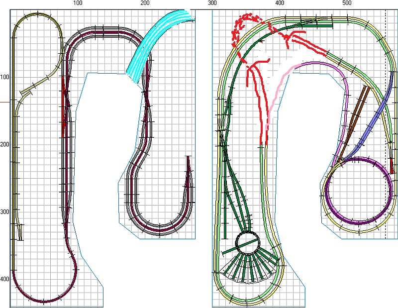 Mal alle scharf hinsehen: im rechten Plan ist bei x=380/y=50 eine ROTE Weiche. Diese bildet die Ausfahrt der hellbraune Strecke (unterirdisch, siehe links bei x=80/y=50) zur grünen Trasse. Damit haben wir allerdings wieder eine Art Wendeschleife eingebaut.