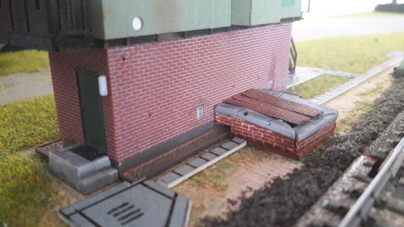Und jetzt wollt Ihr Bilder sehen oder was? Der Unterbau "Ziegel" besteht übrigens aus Polystyrol und wurde lediglich etwas verwittert. Der gemauerte Kasten ("Seilzug-Umlenkung") gehört NICHT zm Originalbausatz. Beschreibung desselben weiter unten. In der Draufsicht erkennt man die Weathering-Spuren auf dem Dach (Faller Patina-Set). Die Gehwegplatten und Seilzug-Kanäle sind ebenfalls eine eigenmächtige Ergänzung: Grauer Architektenkarton, mit schwarzem Kugelschreiber geprägt und passend zugeschnitten. Der Umlenk-Schacht. Die Mauerteile sind aus Gips, gegossen in der Spoerle-Form und stellen eigentlich das Ende einer Bahnsteigkante dar. Für die niedrige Seite wurde ebenfalls ein Rest Bahnsteigkante zurechtgesägt.