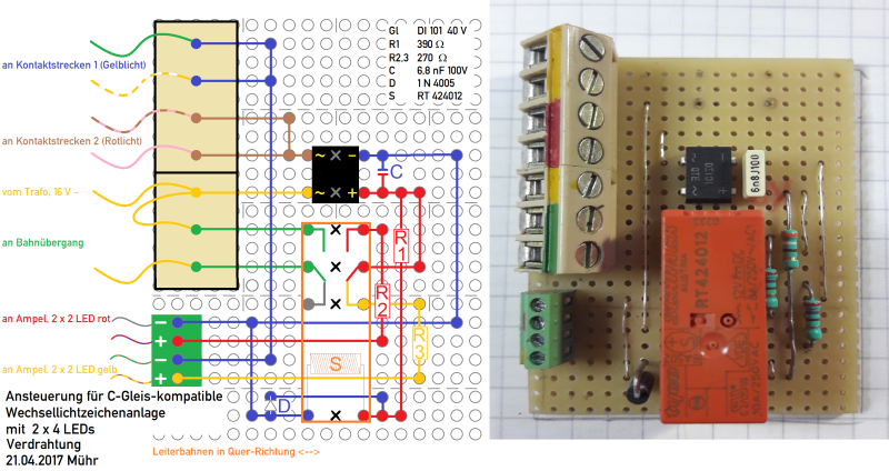 Die Trafospannung wird gleichgerichtet und an die gelben LEDs in den Ampelmasten geleitet, zurück auf die Platine und von da an den Minuspol, der aber in der Kontaktstrecke liegt, also erst leitet, wenn eine Achse im GELB-Bereich eingefahren ist.