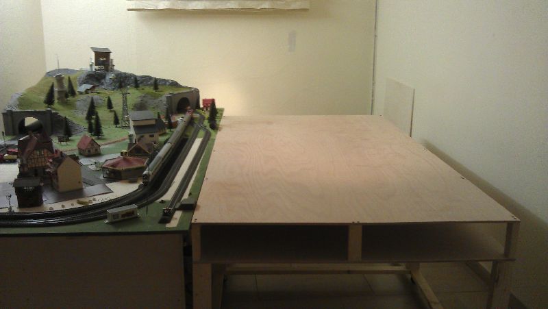 Mit diesem Bahnhof war ich aufgrund seiner Größe nicht ganz zufrieden. Ich entschied mich also die Anlage zu erweitern (genügend Platz war vorhanden). Eine zweite fast gleich große Platte wurde gekauft und daneben gestellt.