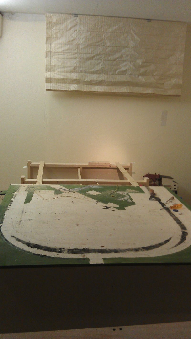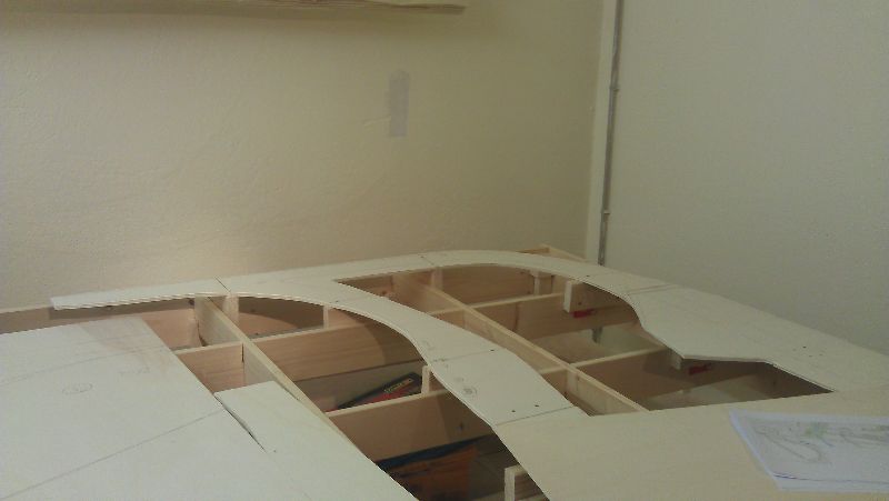 Jetzt war erstmal längere Pause. Es wurde dann weiter geplant und sozusagen die ersten 90 cm von rechts aus gesehen (auf dem Gleisplan oben) genauestens geplant. Das heißt mit Spanten, versch. Höhen, und versch. Platten und Gelände.