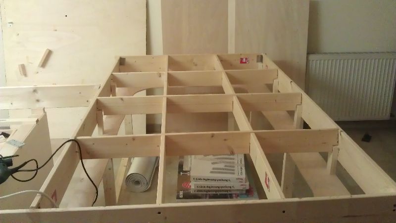Zum Naturholz: Hatte schon in einem anderen Beitrag geschrieben, dass das Material niemals aufhört zu arbeiten. Allerdings findet die meiste Verformung schon beim industriellen Trocknungsprozess statt. Man kann das Material für den Unterbau verwenden, allerdings sollte man im Baumarkt dann auch radikal aussortieren. Das heißt: Cutter einstecken und die gebundenen Pakete aufschneiden. Oft ist inmitten der schönsten Bretter Schund versteckt. Links liegen lassen sollte man all die Bretter, die stark verdreht sind, und die, die große Äste haben, besonders dann, wenn diese sich am Bretterrand befinden. Eine leichte Verdrehung oder eine leichte Verbiegung um die schmale Kante herum ist dagegen nicht so schlimm, da die Bretter ja zu einem stabilen Rahmen verschraubt und verleimt werden.