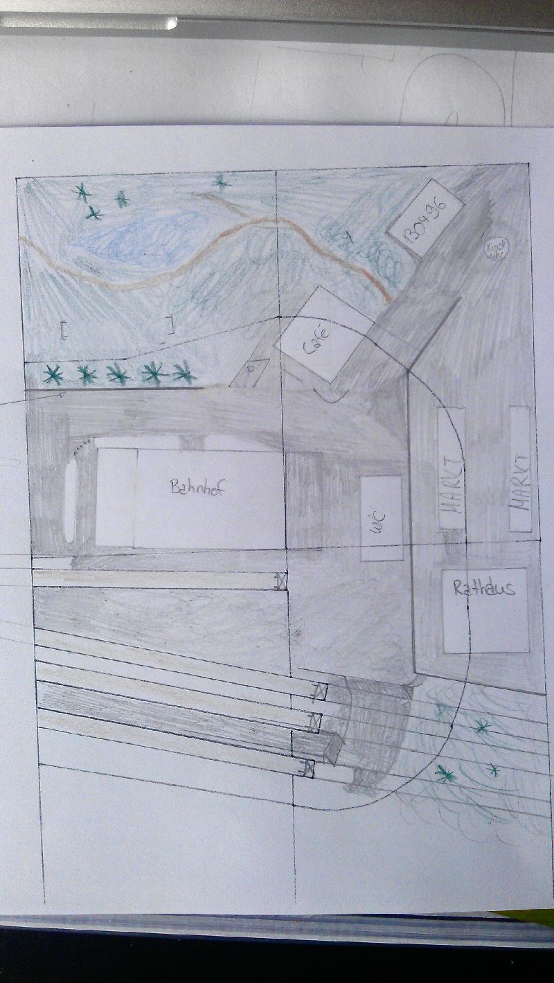 Die erste Zeichnung finde ich nicht mehr aber das hier war eine der ersten, welche den derzeitigen Gleisplan schon relativ genau traf: