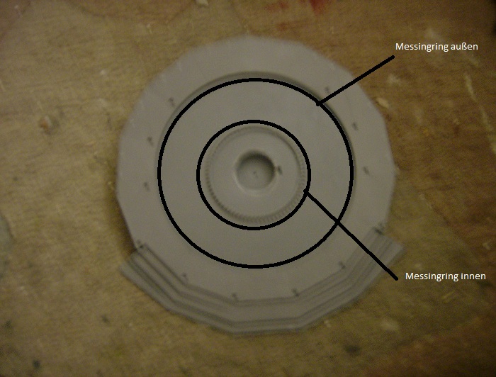 Dabei dachte ich an 2 Messingringe, jedes si ca 1 cm breit, einmal am äußeren Rand des Unterteils der Drehscheibe und einmal einen Ring in der Höhe, wo das Zahnrad des Unterteils ist.