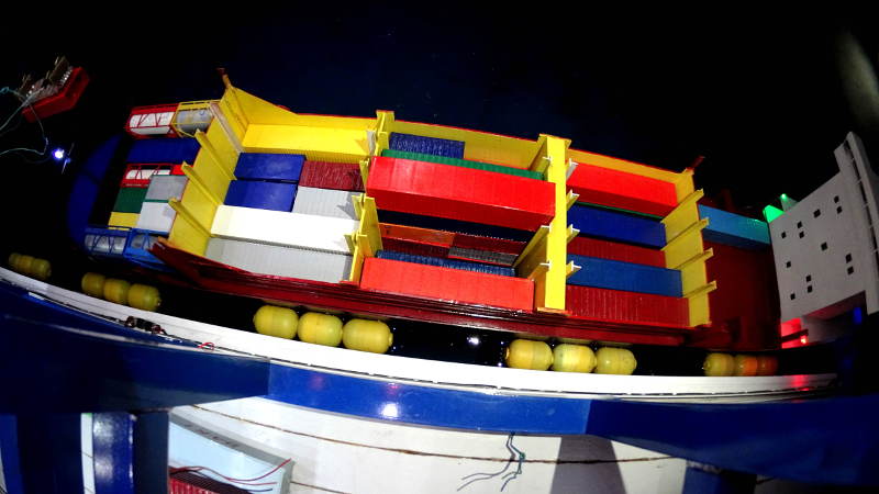 Am Schiff fehlen noch viele Details, auch die Brücke ist noch nicht fertig, aber wir haben es uns nicht nehmen lassen, eine Kamera auf die Brücke zu montieren, die über eine 5,8 GHz Funkstrecke das Livebild an Land sendet. Mehr dazu und die ersten Bilder vom Containerumschlag mit der Containerbrücke im Video: