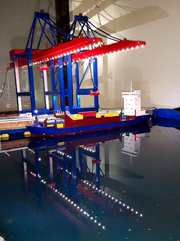 Winterzeit ist Modellbauzeit, auch draußen vor der Türe. Genau dort steht inzwischen mein Wasserbecken und für einen ersten Test stand nun erstmalig die ersten beiden Terminalmodule mit der ersten Containerbrücke am Wasser, um den Umschlag mit einem echten schwimmenden Schiff zu testen. Und so sieht das alles auf Video aus: