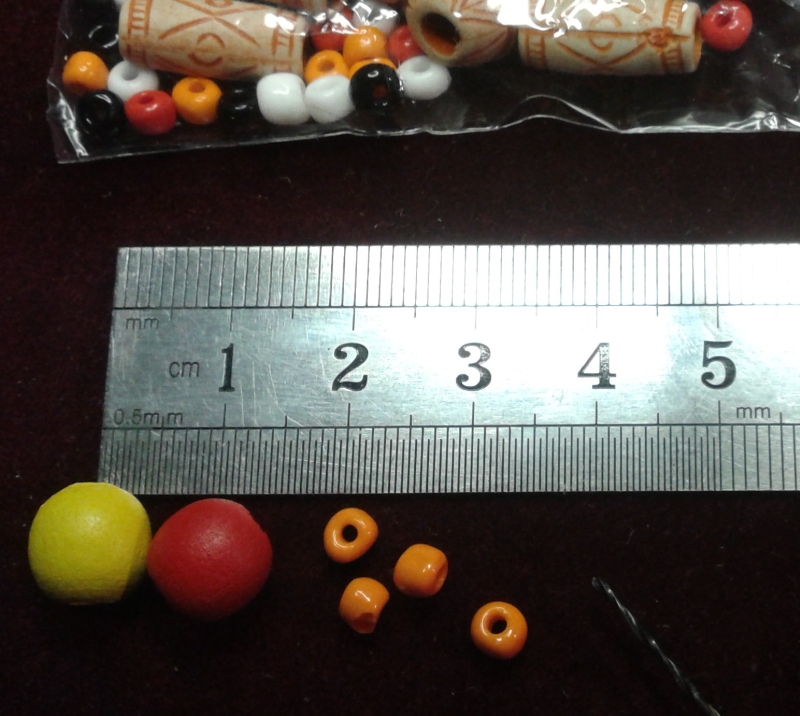 Die größeren (rot und gelb) sind aus Holz.Ein ganz feiner Bohrer liegt auch bereit.
