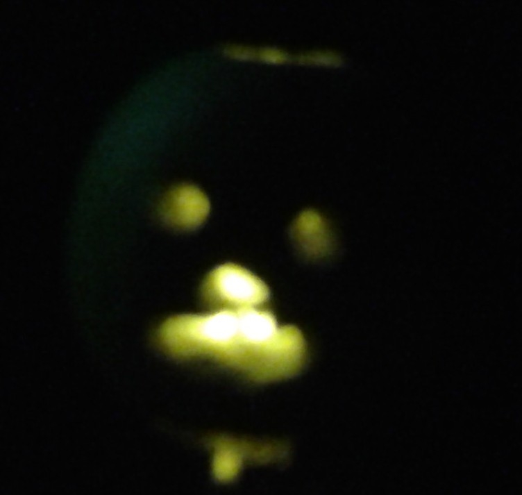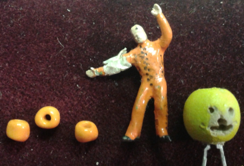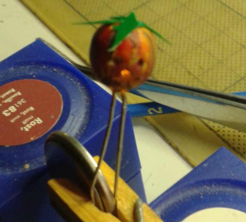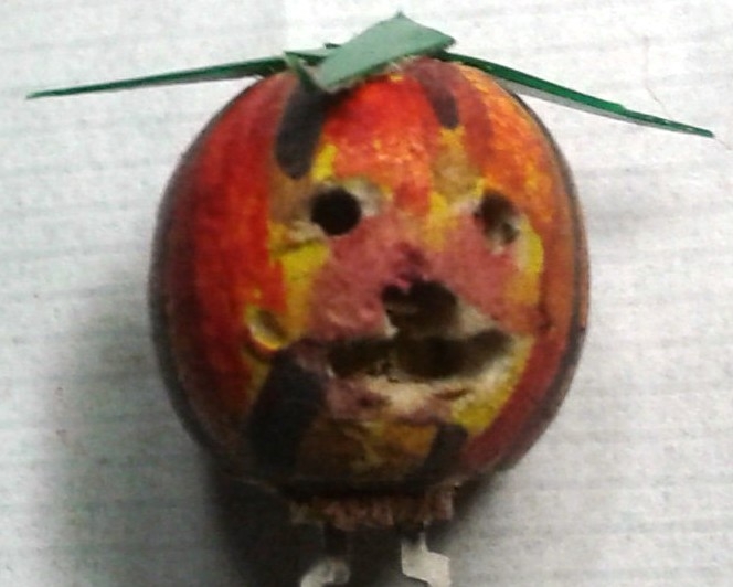Da zücken wir direkt den Zahnarzt-Bohrer und die feine Spitz-Zange,was allerdings keinen Eindruck auf die orange-farbenen Gesellen macht. Die springen immer weg. Also wenden wir uns (immer noch mit dem Zahnarzt-Bohrer) der Holzkugel zu. Mit der Spitz-Zange sicher gehalten haben wir schnell ein Gesichtchen hinein gefräst. Neben dem Dummy sehen wir sehr gut, dass die kleinen eigentlich die richtige Größe hätten. Dafür können wir in die Große ohne weiteres eine 3-mm-LED herkömmlicher Bauart einsetzen. Mit einer hölzerenen Wäscheklammer wird provisorisch eine alte Knopfzelle angeklemmt. Geht.Jetzt noch rasch den Pinsel gespitzt, mit dunkle (z. B. Schwarz) einige Meridiane aufmalen. Dazu spießen wir die Kugel auf einen einfachen Pinselstiel. Mit stark verwässertem Braun (oder Rost)"übermalen" wir die schwarzen Linien, um einige Furchen anzudeuten. Die übrigen gelben Flächen werden, immer noch nass in nass, mit rotbraun ausgemalt.