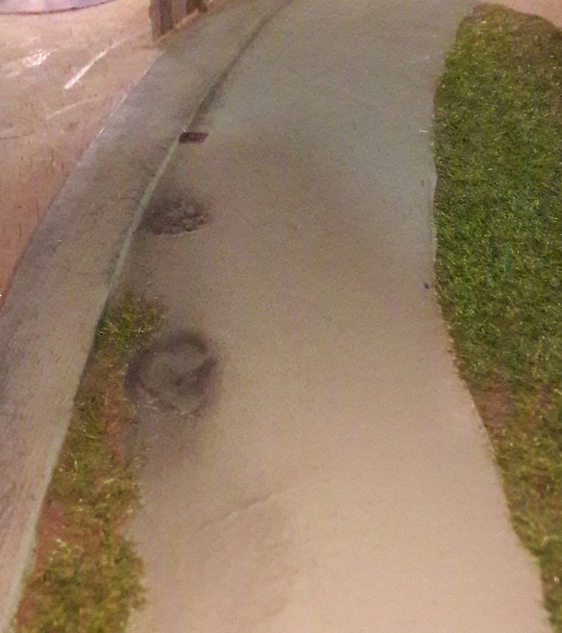 Zum Glück ist mir an einer Stelle die Fräse abgerutscht, so dass die Fahrbahn einige Macken abgekriegt hat. Diese wurden recht schlampig verspachtelt und nach dem Trocknen farblich betont (Staubfarbe dunkel). Fertig sind ein paar prächtige Schlaglöcher. Und da gibt es noch mehr Dinge zwischen Himmel und Asphalt, als Eure Schulweisheit sich träumen lässt. So gehören Gullys und Mannloch-Deckel auf den Kanalschächten zum Alltagsbild.