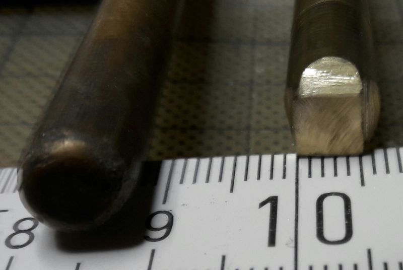Aus der Kramkiste fische ich ein Stück Rundmessing von 8 mm Ø. Das kommt aus einem 400-V-Stecker, der ausgeschlachtet wurde. Aus dem Rund kann man so eben einen Vierkant von 6x6 schleifen oder feilen. Jetzt noch in die Fläche einige Rillen fräsen, so dass vier oder fünf Stege stehen bleiben. (Wer es draufhat, kann die Rillen auch mit der Säge ziehen, aber auf dem kleinen Kreuztisch krieg ich es genauer und, vor allem, gerader hin.)