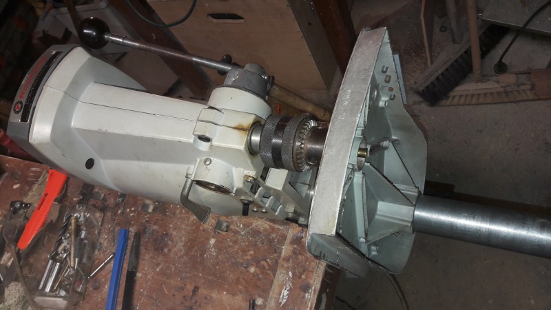 Zunächst musste die Standbohrmaschine zweckentfremdet werden. Als Drehbank-Ersatz wurde sie in den Schraubstock der Hobelbank horizontal eingespannt, da ich sonst keine Maschine mit ausreichend großem Spannfutter habe. Auf einem unter den Bohrtisch gespannten Brettchen hat der Stichel eine gute Auflage.
