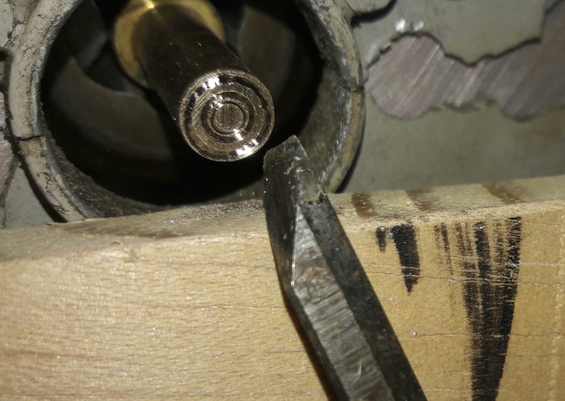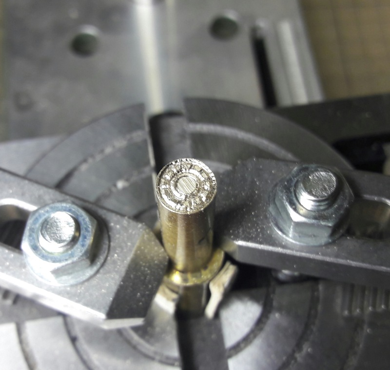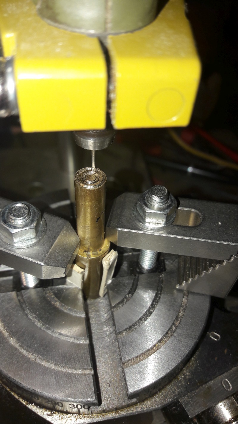 In der MicroMot-Maschine steckt ein Zahnarztfräser von etwa 0,5 mm Ø. Mit dem richtig eingestellten Tiefenanschlag und der Vorwärts-Rückwärts-Bewegung, immer abwechselnd mit einer 30°-Drehung lassen sich nun sehr feine radiale Nuten fräsen.