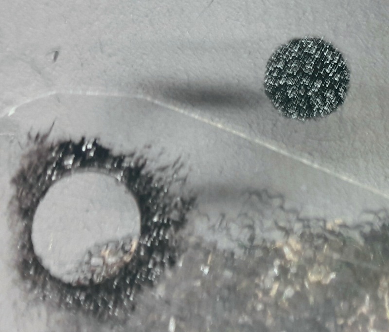 Links ein Versuch mit zwei Schlägen. Durch den ersten Schlag entsteht eine Art Rückprall, der zweite Schlag ist dann leicht versetzt zum ersten und macht das Bild "unscharf".