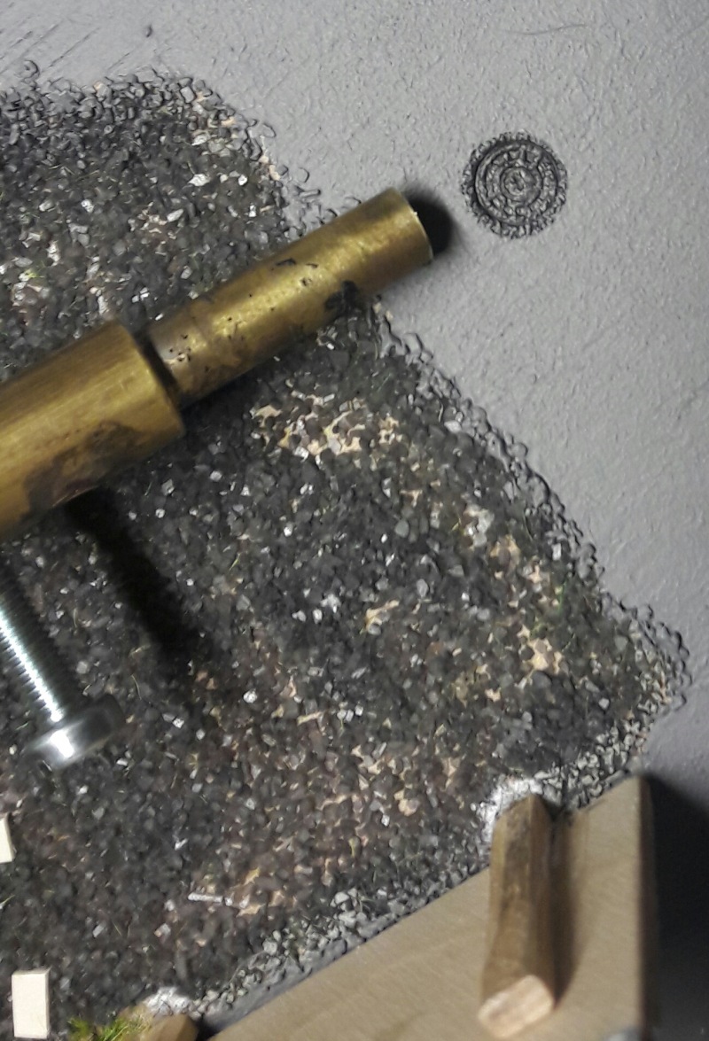 Das sieht dann so aus: Die Fläche in der Mitte eines Schachtdeckels ist bei uns in der Gegend meistens mit Beton, auch mit eingebettetem Kies gedeckt. Das imitieren wir mit ein paar gezielten Körnerschlägen. Fertig zum Test auf einem Reststück schwarzen Kartons. Es empfiehlt sich, dieses Werzeug mit einem einzigen Hammerschlag in den Grund zu treiben!