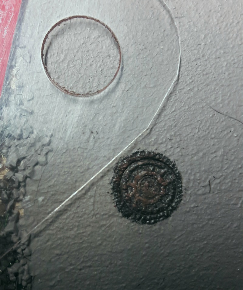 Mittels einer Lötlampe wurde der Stempel erhitzt, um dann das Muster des Mannlochdeckels in den Untergrund (Tischlerplatte) zu brennen. Bei bereits gestrichenen Fahrbahnen löst sich dabei aber etwas Farbe und setzt den Stempel zu. das vermindert auch den gewünschten Schwärzungs-Effekt.