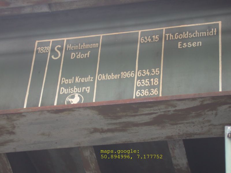 Hein, Lehmann & Co war offenbar ein Brückenbauer, Th. Goldschmitt in Essen vermute ich mal als Stahllieferanten, zu Paul Kreutz in Duisburg finde ich leider nichts, was damit zusammenpassen würde. "1966" könnte das Baujahr sein.