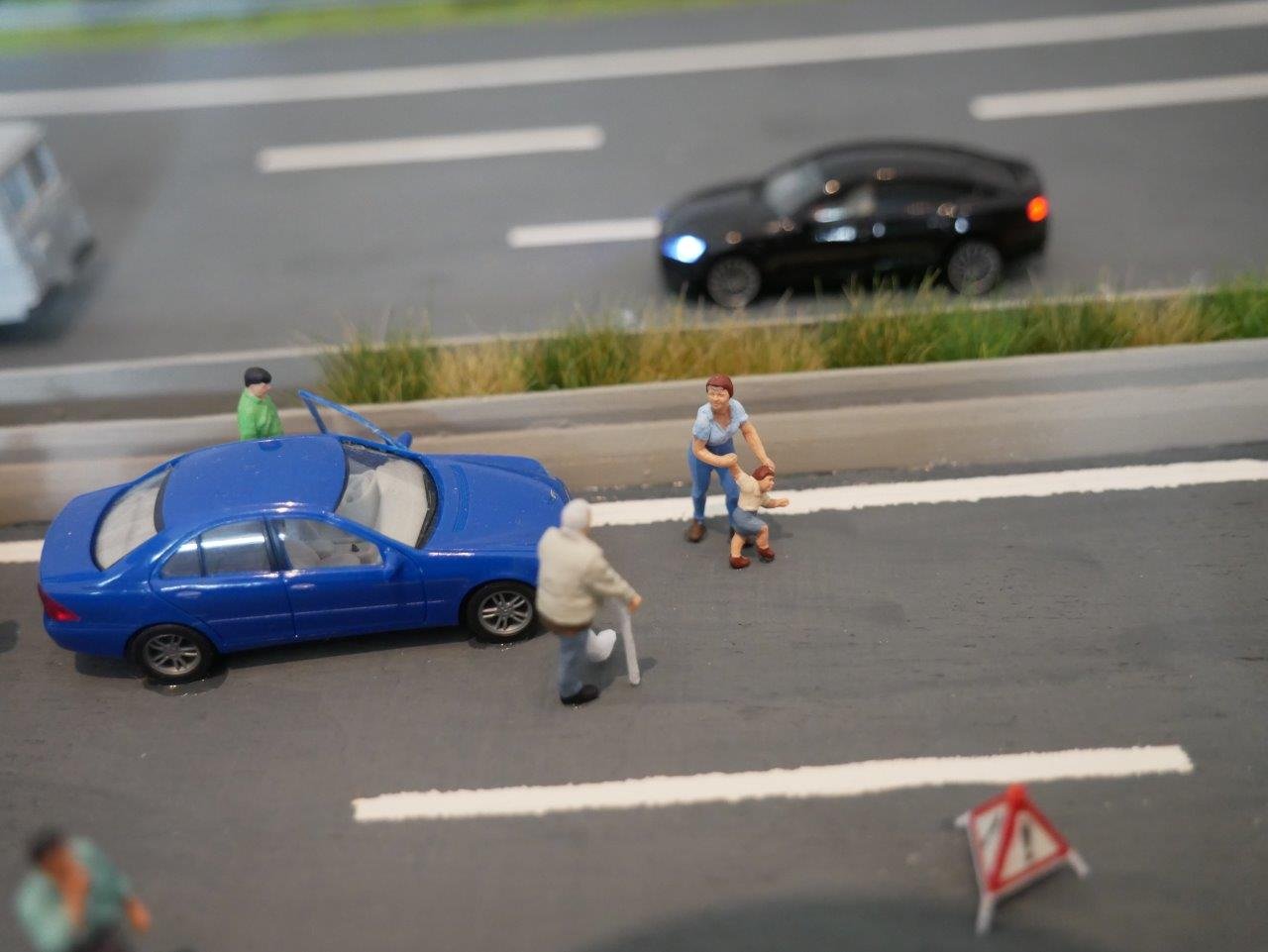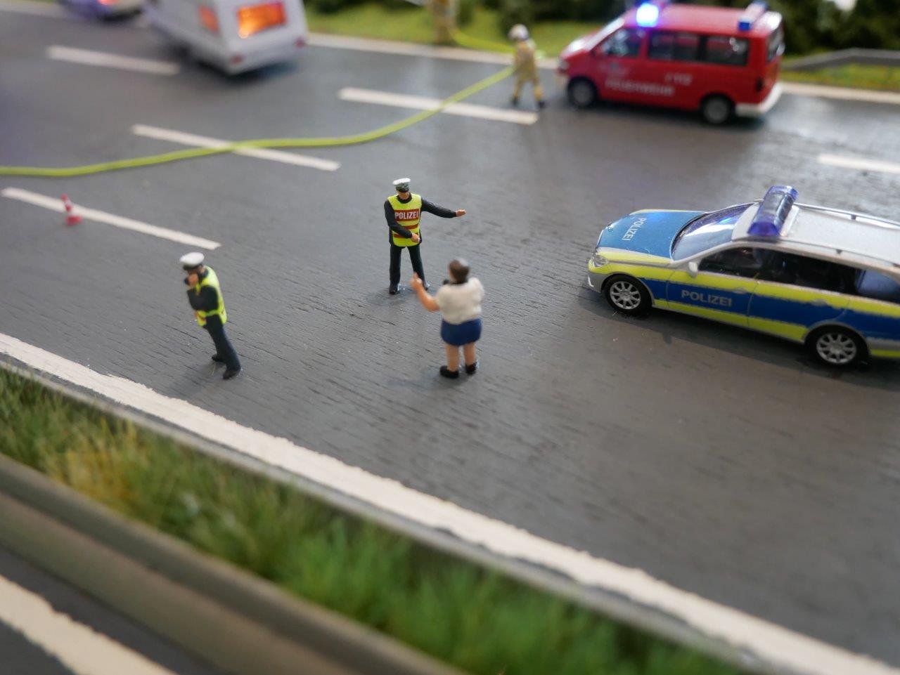 Der Polizist mit der neuen Warnweste ist nicht so schön geworden, wie erhofft, ich war bei dem in Eile (kurzfristige Terminsache) und habe die Farben für die Pinselbemalung offensichtlich nicht genug verdünnt. Egal, der stand eh nur einmal auf einem Diorama auf einer Polizeimesse, mittlerweile ist er wohl mitsamt des ganzen Dioramas (Kontrollstation auf Autobahn mit vielen Warnblitzern und reflektierenden Faltdreiecken exakt nach Vorbild Nissen) im Keller eines Einsatztechnik-Lieferanten verschwunden. Die Uniformfarbe jedenfalls musste ich auch selber anmischen. Stimmt, je nach Lichtverhältnissen sieht die Uniform in Ba-Wü