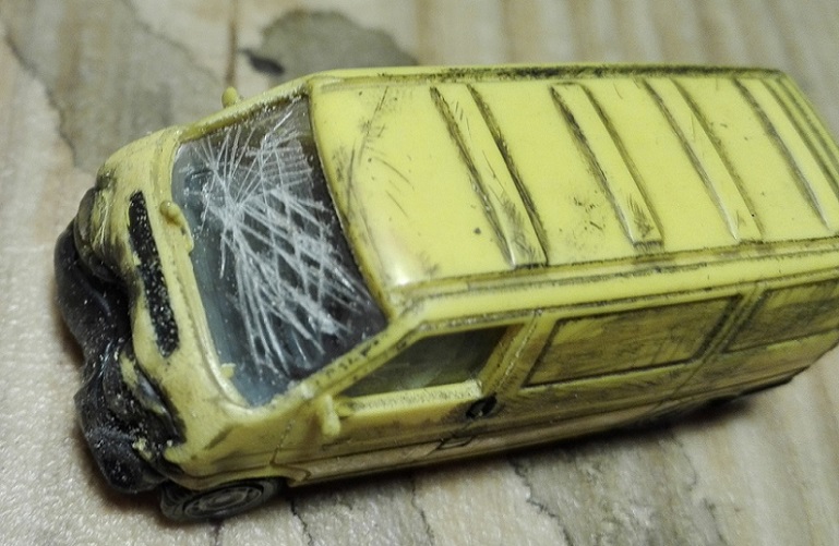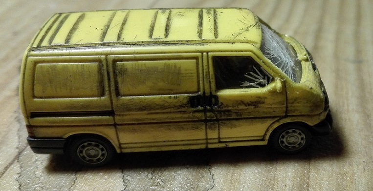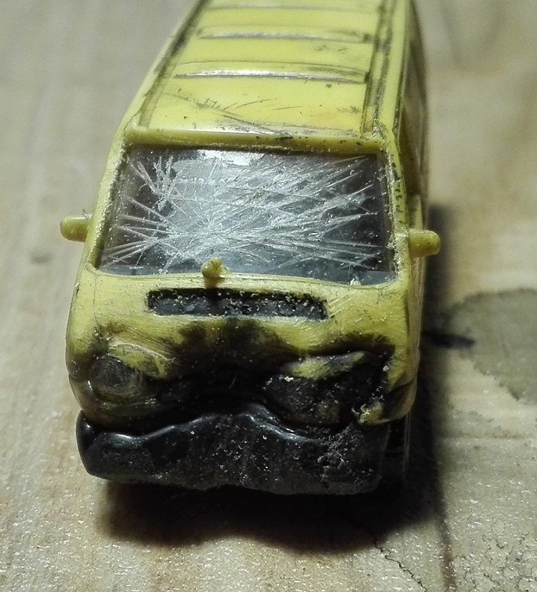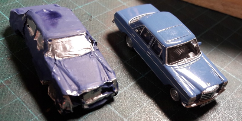 Die Abformung einzelner Teile wie z.B. Motorhaube oder Kotflügel hingegen ist eine durchaus gute Methode, nachfolgende Verformungen etwas naturgetreuer darzustellen. Einziges Problem dabei: Haushaltsalufolie ist arg dünn und verformt sich gelegentlich zu schnell und zu stark. Und sie ist halt insgesamt nicht stabil, muss also zwangsläufig von hinten mit Zweikomponentenkleber o.ä. zur Stabilisierung aufgefüllt werden. Bei der Gelegenheit könnte sich auch das Problem lösen, die Alufolie überhaupt mit dem Plastikmodell zu verbinden.
