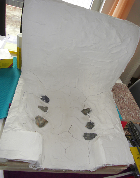 Man trägt die Gipsmasse relativ dick auf und beginnt schon nach einer Stunde mit der Gravur der Felsoberfläche. Wenn der Gips zu trocken wird, dann ruhig nochmal anfeuchten. Erst wenn man mit seinem Kunstwerk fertig ist, dann lässt man ihn austrocknen und dann kommt die farbliche Gestaltung.