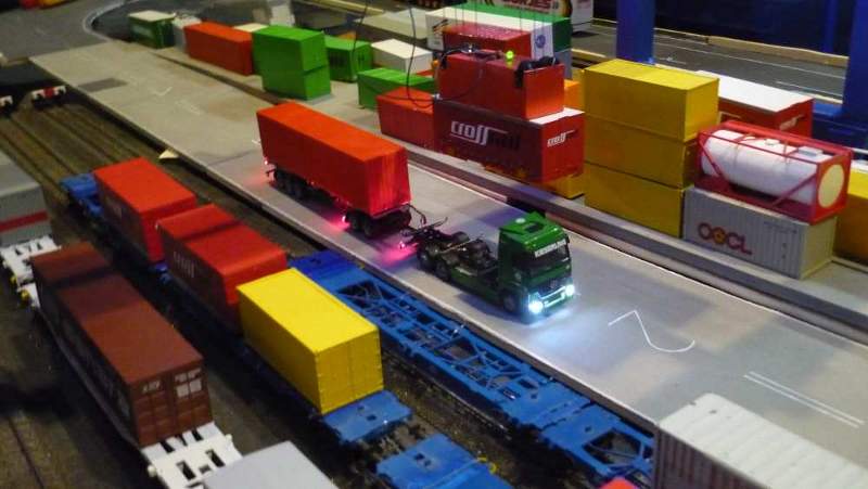 Das mit den Sattelaufliegern ruht momentan, ich warte noch auf die Kupferfolie. Währenddessen gehts weiter an den Containern (Ausstattung mit Lochblech, Lackierung), aber auch am Terminal (Lagerplatten) und viele andere Baustellen. Car System Fahrzeuge müssen noch modifiziert werden, Eisenbahnfahrzeuge ebenso, es geht auf breiter Front vorran.